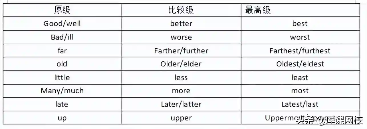 在英文中有少数词的比较级和最高级的变化是不规则的,对于这些词我们只好牢固地记住掌握。