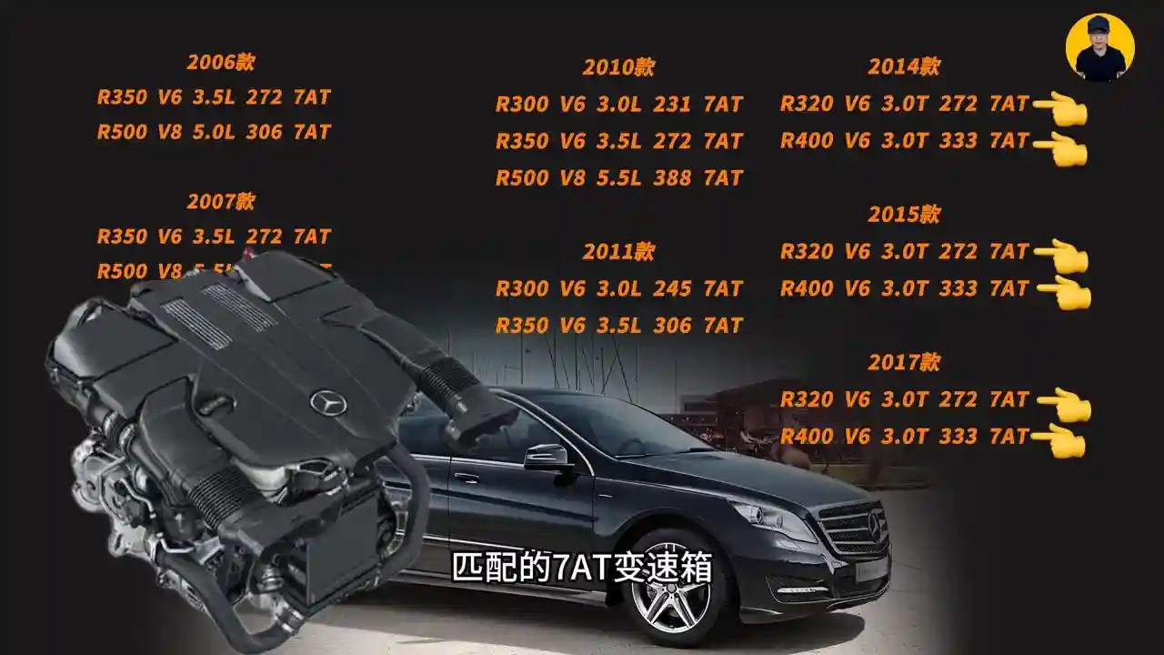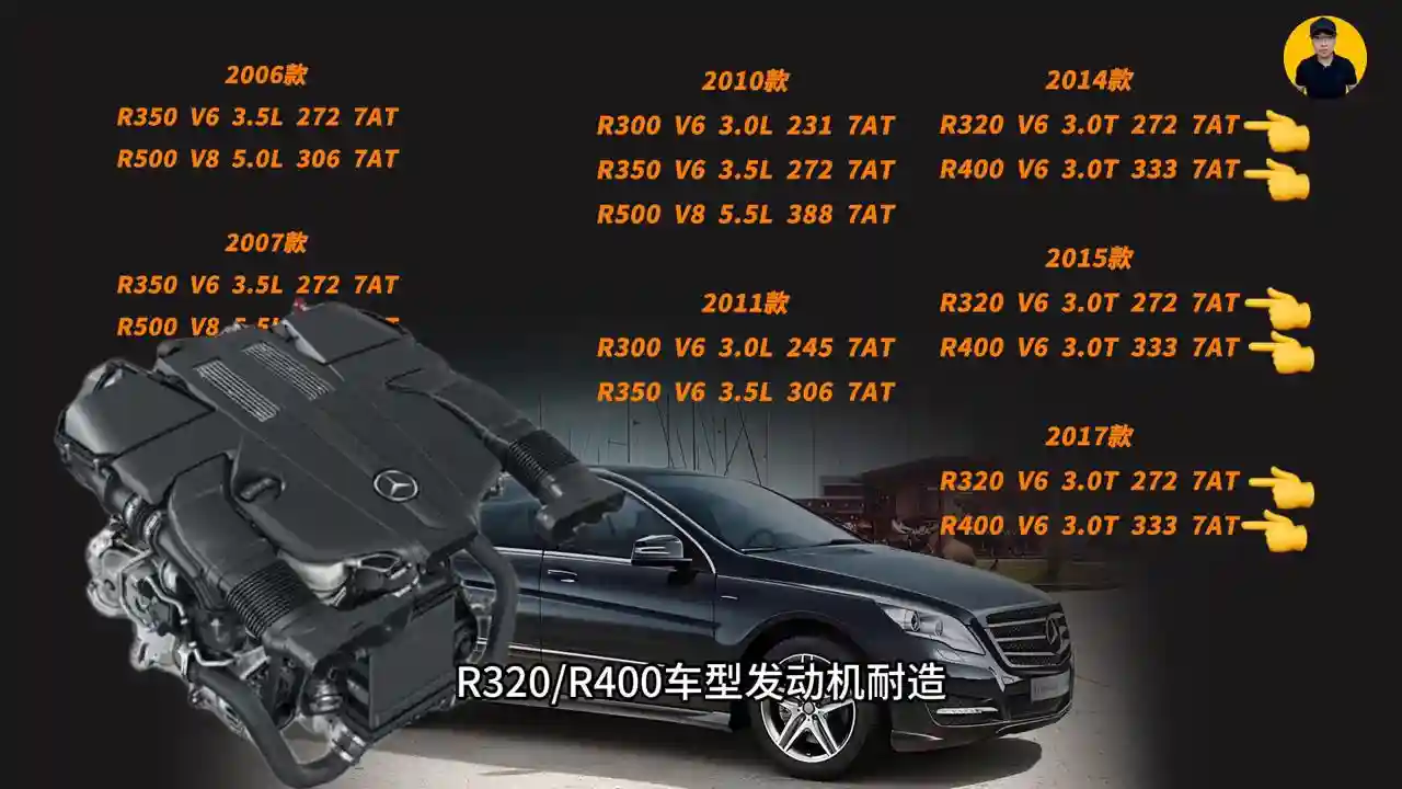 所以奔驰R级的车我只推荐14款以后R320/R400车型发动机耐造。14款之前的车型都是自吸的,3.0/3.5自吸的发动机对于2.4吨的车重还是比较勉强的,而且早期272的发动机不耐造。14-17款的车因为车龄也不短了,而且也算是比较小众的车子,所以也没有个准确的行情价。按每年跑1万公里的车子来看,现在二手市场10-15个左右算是一个正常行情。