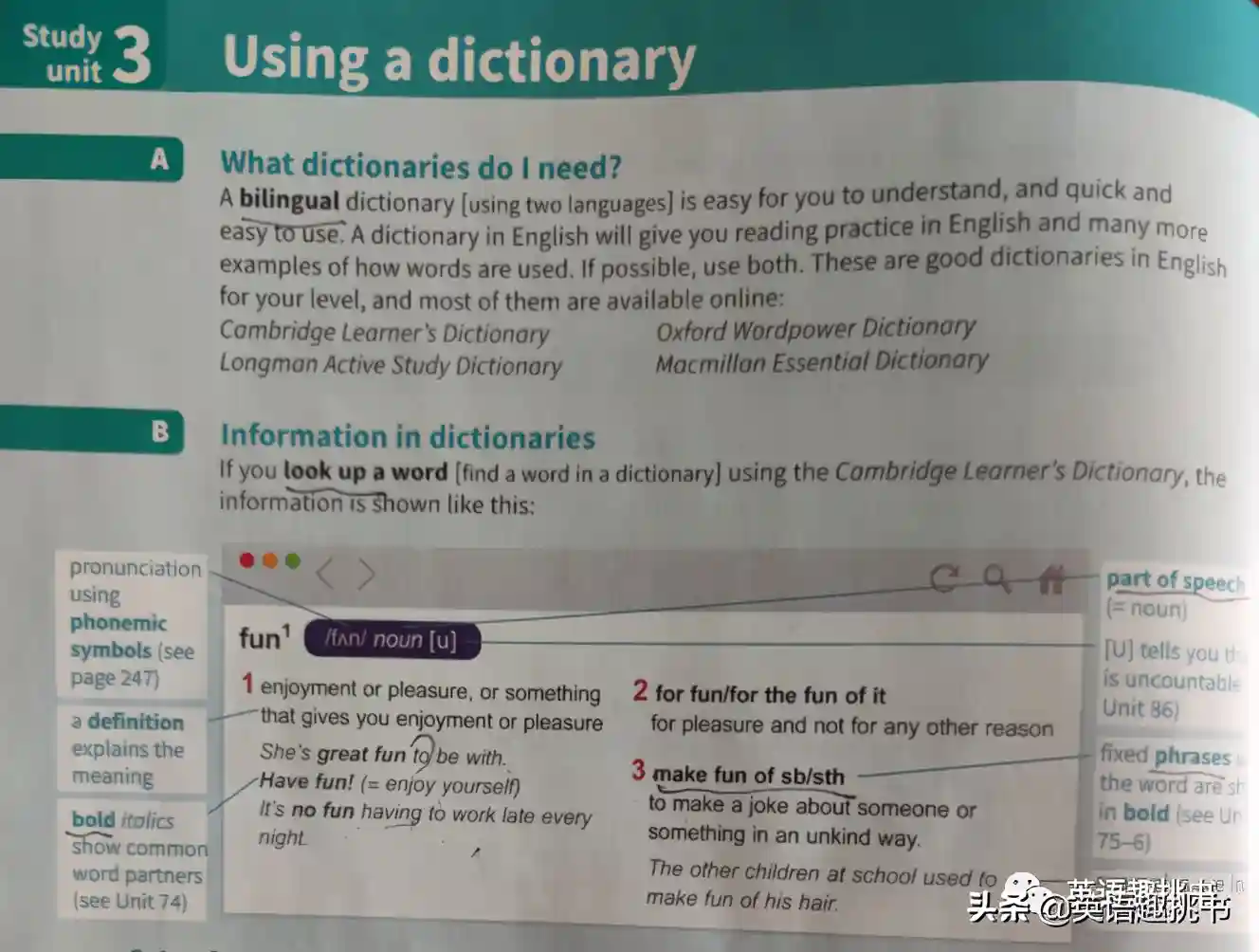 1、前3个单元是教学习词汇的方法,具体到如何用这本书,每个单元的词汇该如何学,复习该怎么做,词汇笔记该怎么记,还教你如何查字典等。对于刷词汇找不到门道的家长,可以仔细研读一下前3个单元,受益匪浅!