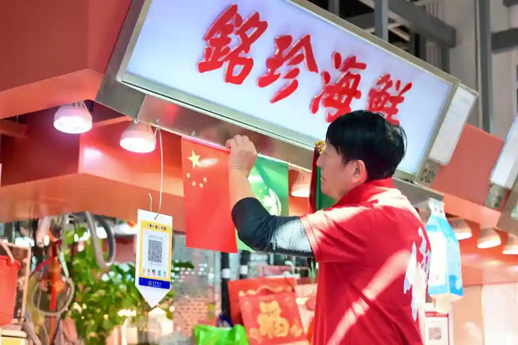 澳门红街市的一家鱼档业主关伟铭在档位上挂起崭新的国旗区旗,还特意穿上喜庆的衣服。“习主席的惦念,让澳门人都非常感激。我写了一副对联:‘盛世龙传镜海兴,街市当红百业旺’,想告诉习主席,我们的日子越来越红火。”他说。