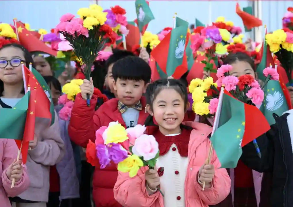 12月18日下午,中共中央总书记、国家主席、中央军委主席习近平乘专机抵达澳门,出席将于20日举行的庆祝澳门回归祖国25周年大会暨澳门特别行政区第六届政府就职典礼,并视察澳门。这是欢迎人群。新华社记者谢环驰摄